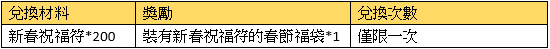 活動描述:活動期間,使用指定物品即可兌換超值獎勵,商城上架新春祝福符:100點券/1個。