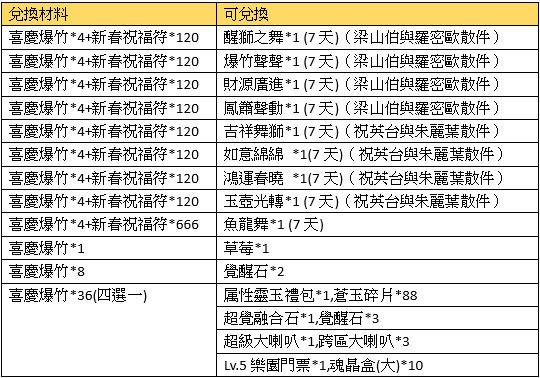 活動獎勵:新春祝福符*6,蛻變晶石*3,中級能量石*2,卡魂寶珠*2,技能升級靈珠*8,Lv.1樂園門票*1