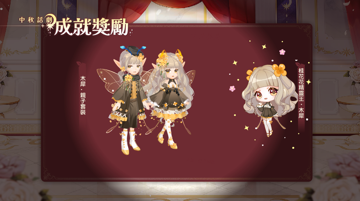 觀影中秋話劇,達成成就可獲得木犀·親子套裝、桂花花精靈王·木犀、白/黃/紅桂花花種、稱號:浮月映木樨、通關結局還可獲得結局限定稱號等獎勵。