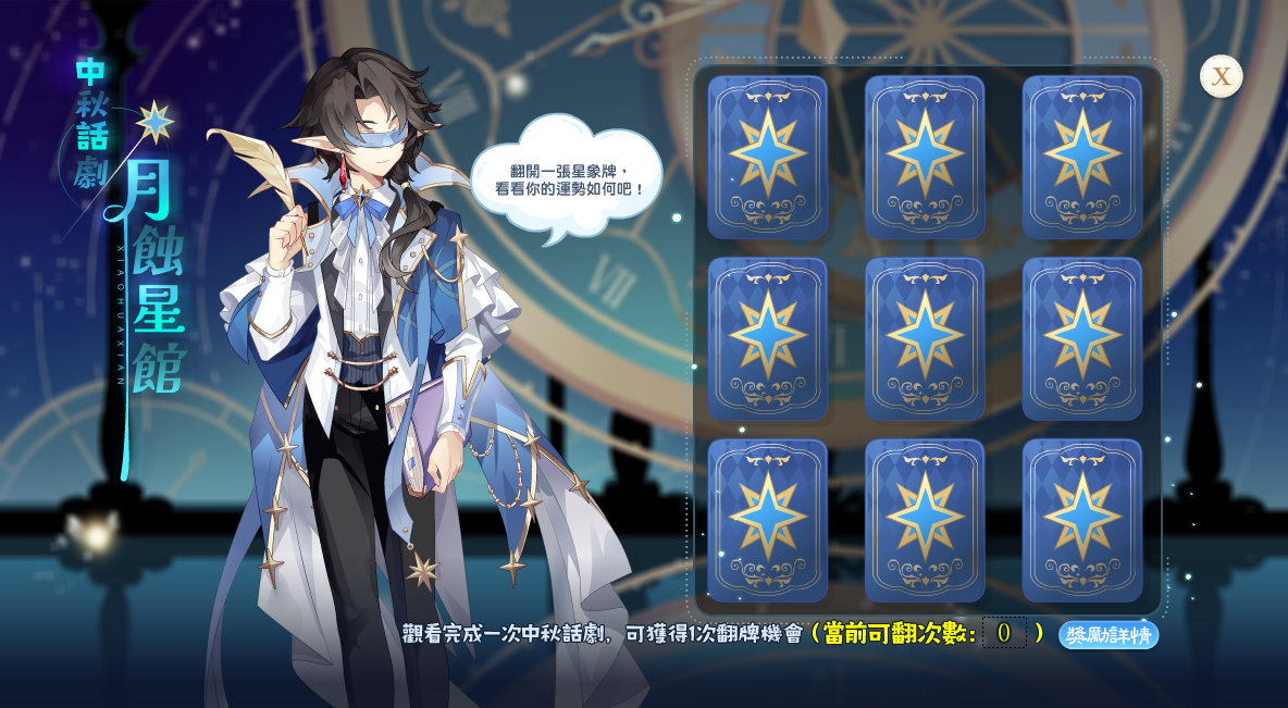 每觀看完一次中秋話劇,可獲得一次翻牌機會,可在月蝕星館抽取:月蝕王座背景秀(30天)、月蝕王冠背景秀裝飾、桂花花種、星光棒獎勵。