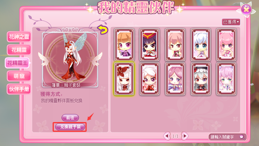 擁有朱頂紅·蓮華花精靈王,可在我的精靈夥伴-花精靈王-蓮華處,消耗朱頂紅花朵兌換蓮華·親子套裝!