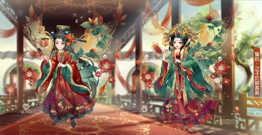 集齊【誓約·之子於歸套裝】【十里紅妝背景秀裝飾】即可領取獎:永結同心單人全屏背景秀(30天)、永結同心雙人全屏背景秀(30天)